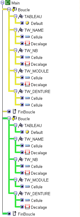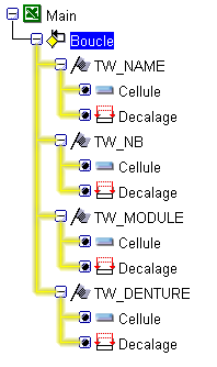 Sous le module boucle, se trouvent les modules Données (TW_NAME, TW_NB, etc..) qui recevront les valeurs à lire depuis les cellules du fichier Excel.