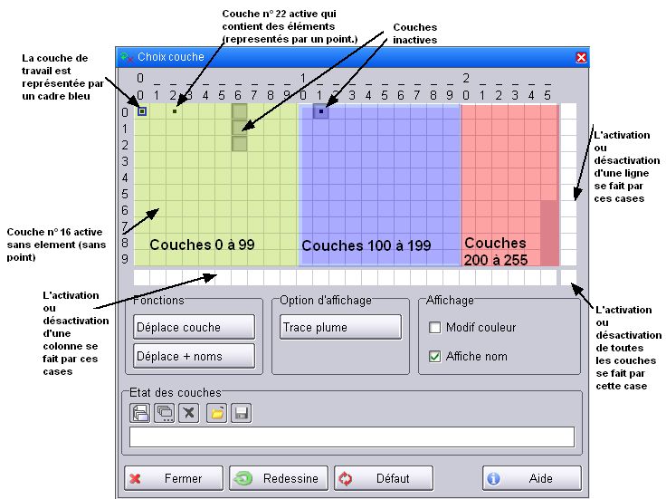 Un total de 256 couches sont disponibles. Les différentes couches sont représentées par des cases qui peuvent être enfoncées (désactivées) ou non (activées). Pour activer ou désactiver une couche il suffit de cliquer sur celle-ci.