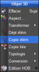 Les clones sont des entités (objets volumiques ou pièces 3D) obtenues par copie. On distingue deux types de clones (voir Clones 2D et 3D ) : •les « clones liés » : quand un élément est modifié, tous sont modifiés de même. •les « clones non liés » : quand un élément est modifié, il sort de la famille. Cette page concerne plus particulièrement les objets. Concernant les pièces (3D ou 2D), voir la page Clones pièces. Création Les entités concernées sont exclusivement les objets 3D et les pièces 3D. Seule la fonction Copie élém est significative pour créer et agrandir une famille de clones. Certains paramètres de ces entités resteront les mêmes, d'autres peuvent être variables. Les entités d’une même famille de clones peuvent avoir une mise en plan commune. Si une mise en plan est associée à une entité d'une famille de clones, alors toutes les entités de la même famille partagent cette mise en plan. La première entité copiée sert de référence pour toute la famille de clones. Modification La modification (avec un paramètre différenciateur) d'un clone lié entraîne la modification de tous les autres clones de la même famille. La modification (avec un paramètre différenciateur) d'un clone non lié entraîne sa sortie de la famille de clones. Clones liés ou non Les clones (non liés) Les clones sont une famille d'objets 3D, de composants 3D ou de pièces 3D. Un clone est créé à partir de la fonction « Copie élém » se trouvant dans le menu contextuel.