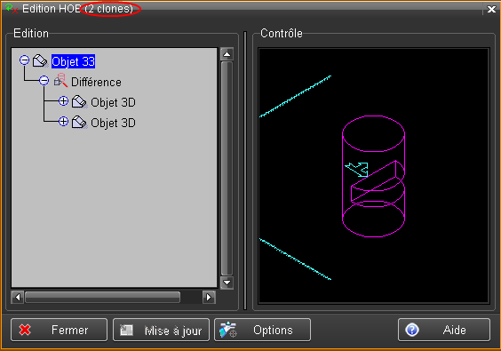 Le nombre de clones appartenant à une même famille est indiqué dans la Fenêtre pièces quand un clone est sélectionné, ou quand la Mise en plan liée à un clone est sélectionnée. Il est aussi indiqué en titre lors de la Modification d'une pièce ou de l'édition du HOB d'un objet.