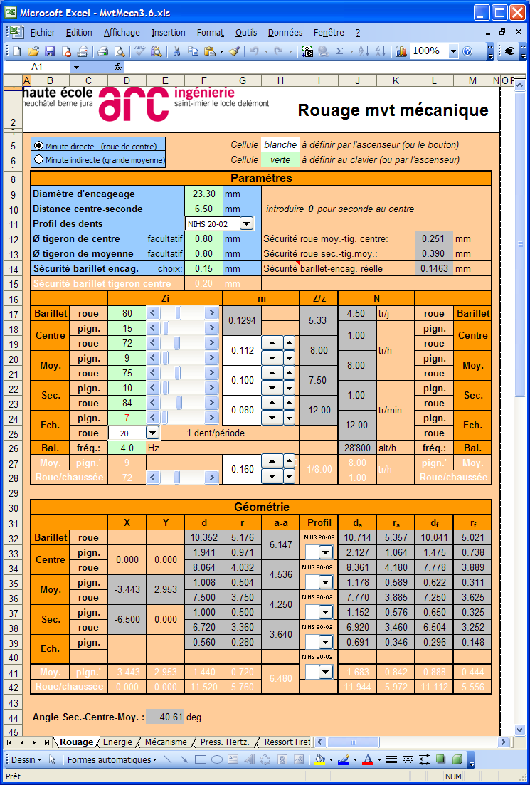 Principes de base Sur la base d’un fichier Excel dans lequel sont calculés les différents rapports, nombre de dent, module et entraxe d’une chaîne d’engrenages, les différentes roues peuvent être créées et positionnées dans Tell. AiM Services met à disposition la feuille de calcul Excel élaboré par la haute école de l’ARC.