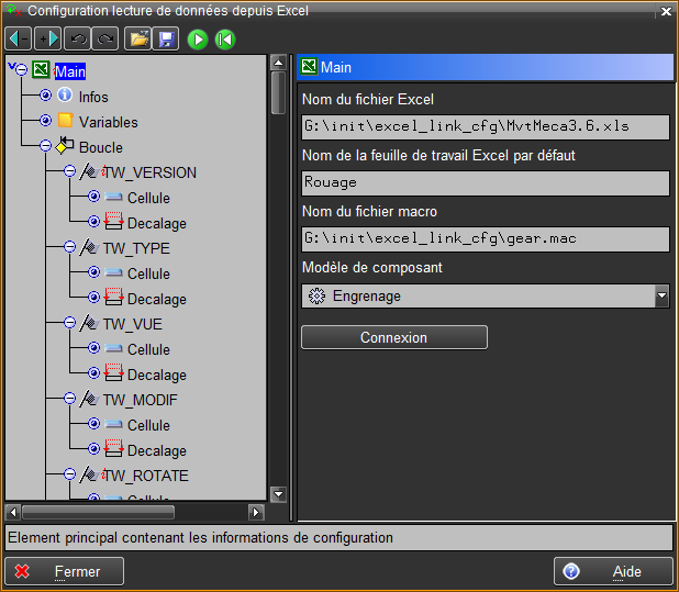 Les paramètres sont traités dans le fichier Excel puis l’on exécute un fichier de configuration permettant ainsi de créer et positionner les composants de la chaîne cinématique.