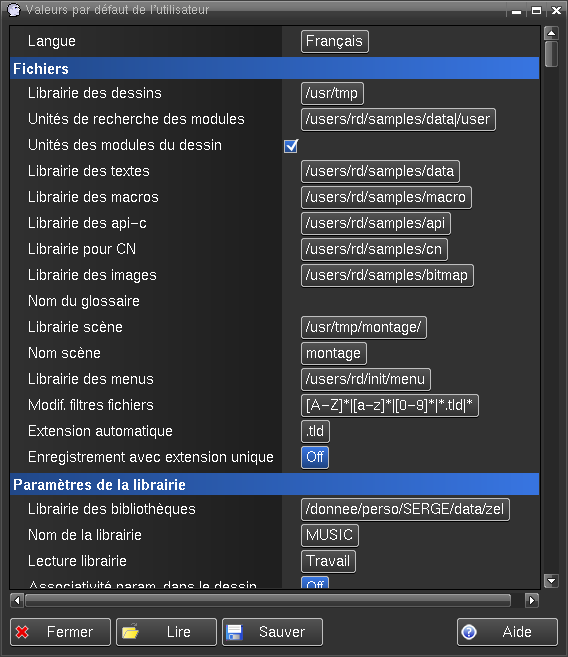 Permet de modifier les préférences de l'utilisateur, dont notamment les paramètres par défaut: de sauvegarde des fichiers, de l'interface utilisateur, des cotes, des textes et de traçage. Cette fonction est complémentaire de la fonction Options (1434). Valeurs par défaut