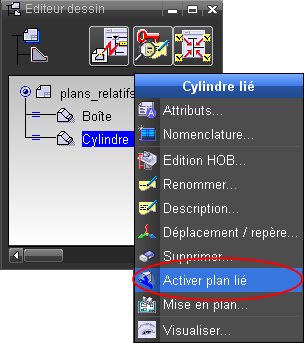 Dans cet exemple, le "Cylindre" est porteur d'un plan lié à l'objet "Boîte".