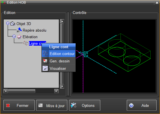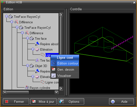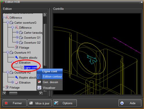 L'édition d'un contour 2D utilisé pour une fonction de création est activée en sélectionnant la ligne "Ligne contour" dans le HOB, en faisant MODIF et en choisissant "Edition contour".