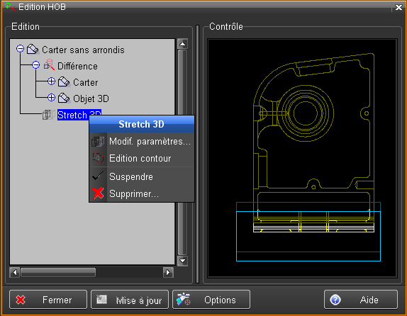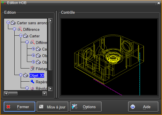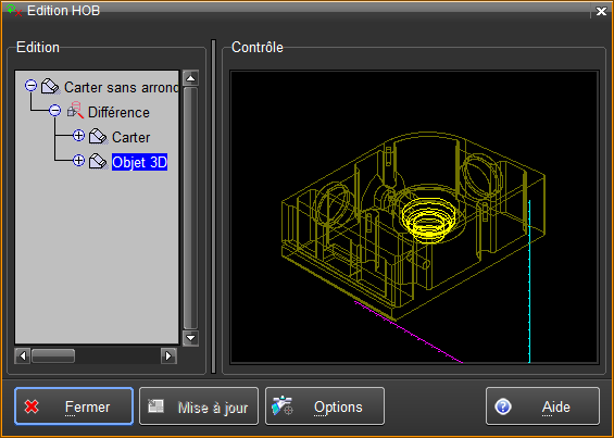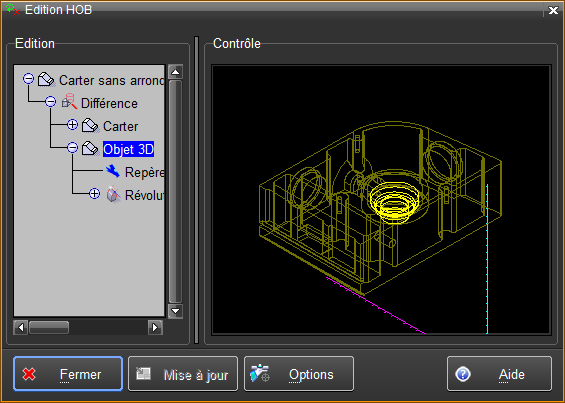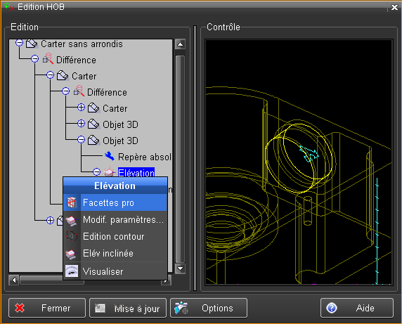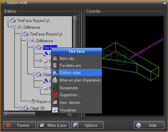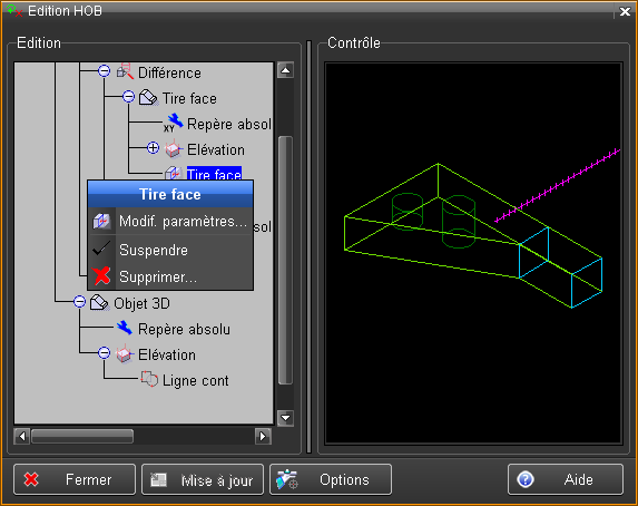 L'édition d'un objet utilisé dans l'historique de création ou HOB, est activée en sélectionnant la ligne "Objet 3D" dans le HOB, en faisant MODIF et en choisissant "Edition objet".