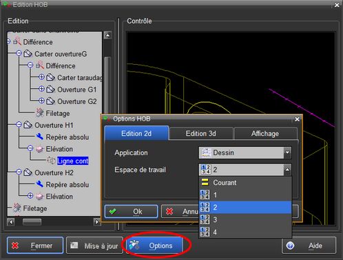 Les options du HOB permettent de choisir l'environnement dans lequel l'édition du contour 2D se fait (idem pour le 3D) : l'application et l'espace de travail.