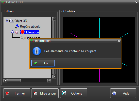 Dans ce cas, l'icone est affichée sur la ligne qui pose problème, et l’état précédent de l’objet 3D final est rappelé automatiquement.