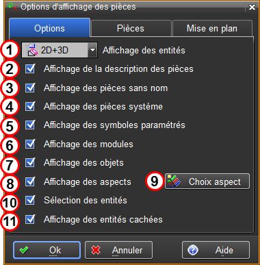 Cette option permet d'afficher ou pas les aspects des pièces.