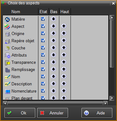 Cette option permet de sélectionner les aspects affichés ainsi que leur ordre d'affichage.