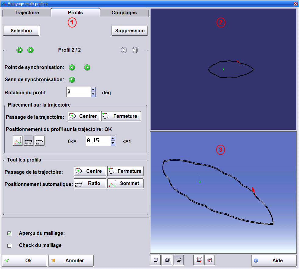 Création des couplages fixes : les boutons verts permettent de passer d'un sommet à un autre. Interpolation entre un couple de profil : on peut choisir le type d'interpolation entre deux profils consécutifs (linéaire, cubique, quadratique, sinus...) Couplage automatique : le couplage automatique permet de coupler les sommets de manière automatique entre deux couplages fixe. •Ratio : c'est le mode par défaut, les sommets se reportent sur le profil suivant et précédant en fonction de leur ratio. •Sommets couplés puis ratio : si entre deux couplages fixes on a le même nombre de sommets libres, on les associe, sinon on passe en mode ratio. •Sommets brisés puis ratio : idem mais avec les sommets brisés. Tous les couples de profils : on peut appliquer une interpolation ou un couplage automatique à tous les couples de profils. Calcul et check du maillage : l'option de calcul automatique du maillage lance le calcul du maillage, et relance le calcul en cas de modification des inputs. Une option de check du maillage permet de visualiser les facettes qui s'intersectent et de modifier les inputs du « multi-sweep » pour remédier à ce problème.