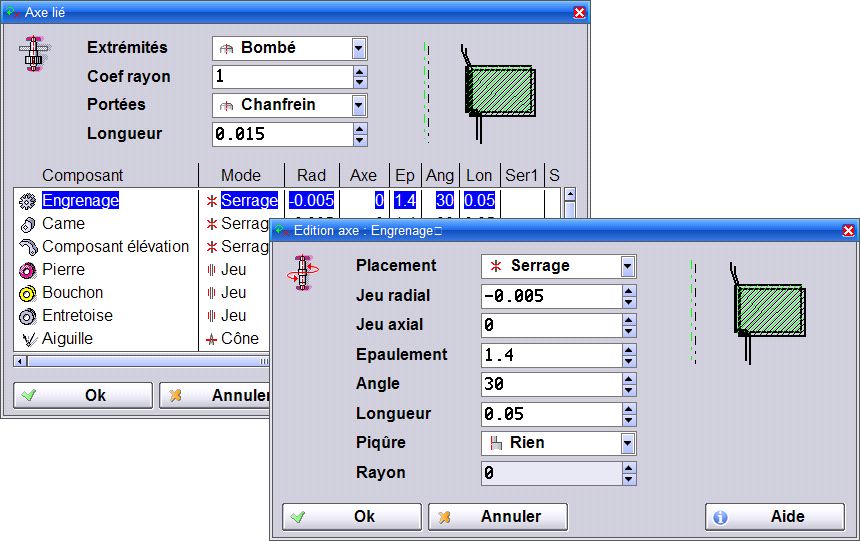 Un « Axe lié » est modifiable. Pour cela éditer l’axe lié puis avec la touche « MODIF » de la souris sur un des composants lié à l’axe il est possible pour chaque portée de modifier les paramètres associés aux composants.