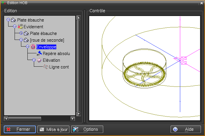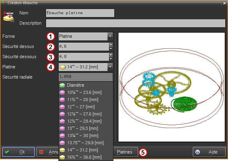 Permet de créer une ébauche de platine à partir d'un rouage existant. Une fois les composants du mécanisme positionnés, la fonction « Ebauche » propose une liste de dimensions pour l’ébauche en fonction de l’encombrement de l’ensemble des composants du mécanisme. L’ébauche est composée d’un contour de tournage et d’un contour d’élévation que l’on peut modifier dans l’historique de construction (HOB).