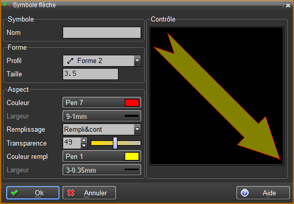 Cette fonction permet la création et la modification du symbole système flèche. La forme de la flèche est modifiable, il est possible de représenter le bord de la flèche ou pas et de fixer un niveau de transparence. Si le symbole flèche n’est pas nommé il est affiché dans l’éditeur de dessin uniquement si l’option ‘Affichage des pièces système’ est activée.