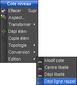 Cette fonction permet d’ajouter une ligne de rappel sur les cotes de niveau. Elle se trouve dans le menu contextuel de la cote de niveau. Il est également possible de modifier la position d’une cote de niveau en sélectionnant avec la touche Modif la ligne de rappel.