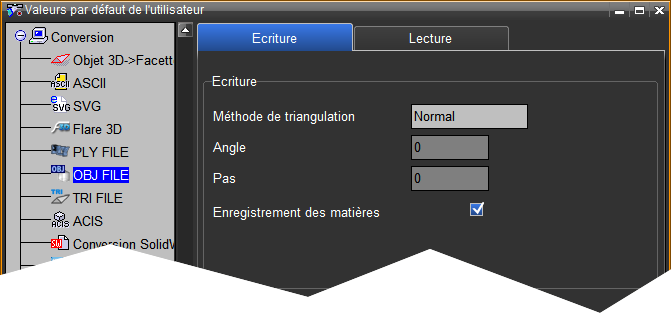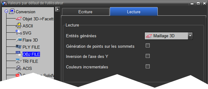 Il est possible, dans les valeurs par défaut de l'utilisateur, de modifier les options de lecture et d'écriture des fichiers au format .obj