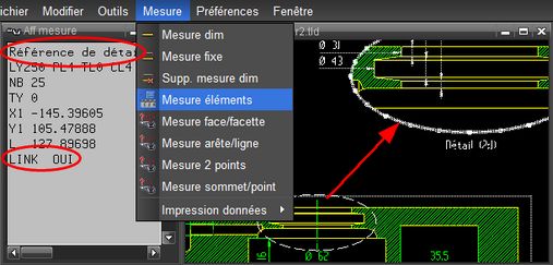 •sur un détail de zone vue ou le contour de référence d'un détail, le système indique l'existence du lien (« LINK OUI ») et met en évidence dans le dessin à la fois le détail et la référence.
