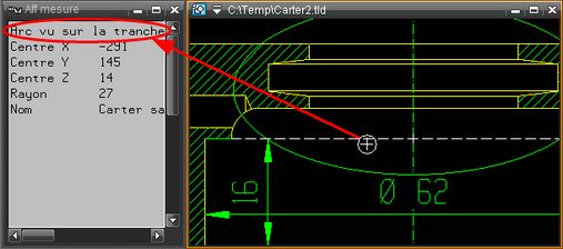 •sur les objets, elle agit comme la fonction Mesure objet •sur les Zones vue (clic sur le contour de clipping ou dans le vide de la vue), autre informations : échelle, affichage, vue coupée. Le système indique aussi s'il existe un lien sur une ligne de coupe : « LINK OUI ».