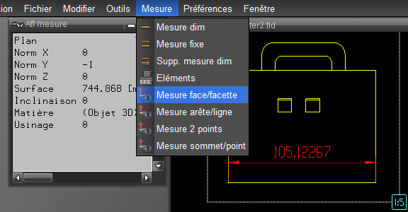 Le menu « Mesure » en mode mise en plan propose une sélection de fonctions s'appliquant au 2D de la mise en plan (cartouche et autres), à l'habillage 2D des Zones vue , ainsi qu'aux entités 3D visibles dans les zones vue ou dans les éventuelles fenêtres 3D hors mise en plan.