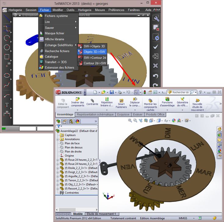Il est possible de transférer une pièce ou un assemblage de SolidWorks vers Tell. Le transfert est réalisé par reconstruction de l'arbre des fonctions de SolidWorks.