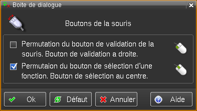Voir la fonction Extension des fichiers. Interface Boutons de la souris (2314) Permet de modifier les affectations des fonctions de base sur les boutons de la souris. Cette fonction modifie le positionnement sur la souris de la fonction de validation (0), de la fonction de sélection d'une fonction (578) et de la fonction de modification (583).