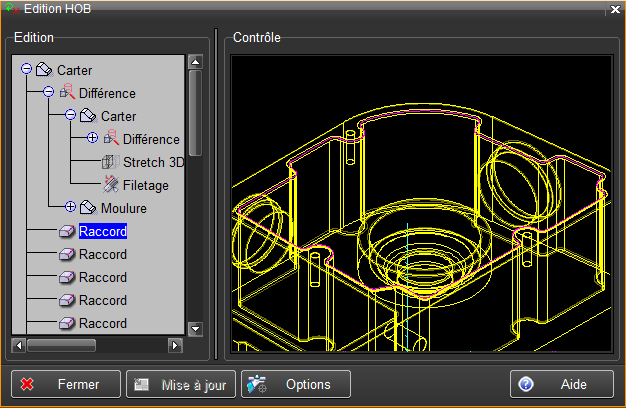 Voir les fonctions Clonage objets et Déclonage objets . Raccord Création de raccords (ou "arrondis", "congés") sur un objet volumique, modifiables lors de l'édition de l'arbre de construction.