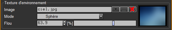 Voir la fonction Symbole de lubrification . 3D Texture d'environnement Il est possible d’associer une texture d'environnement à une matière et éventuellement de modifier le flou de l'image de la texture pour rendre l'aspect de la matière plus brillante ou mat.