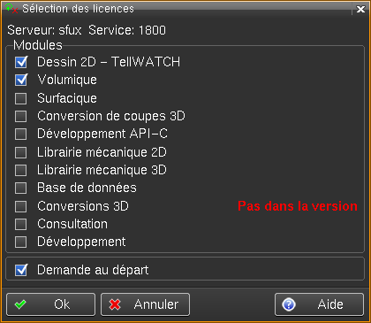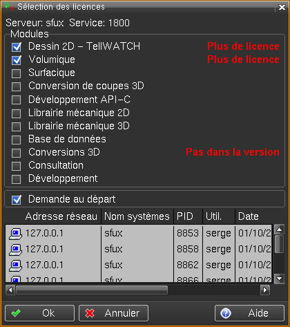 Ce tableau contient la liste des modules à disposition de l'utilisateur, ainsi que le n°TCP/IP du serveur de licences et le n° du port UDP. L'utilisateur peut sélectionner un ou plusieurs modules selon ses besoins. Il est important de ne sélectionner que les modules nécessaires, afin de ne pas s'approprier de licences inutilement. S'il on utilise souvent la même sélection, on peut désactiver l'option "Demande au départ" ; la liste ne sera plus proposée au démarrage de Tell. Toutefois s'il on désire ultérieurement modifier la sélection, on peut le faire en éditant, avec la fonction "Fichiers système", le fichier Si plusieurs utilisateurs utilisent les mêmes licences on peut copier puis renommer le fichier Si la licence principale de dessin n'est plus disponible, la liste des utilisateurs est affichée au bas de la fenêtre de sélection des licences.