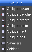 Orthogonal , Isométrique , Dimétrique , Trimétrique , Cabinet , Cavalière , Cabinet, Cavalière , Oblique haut , Oblique gauche , Oblique droite , Oblique devant , Oblique bas , Oblique arrière , Perspective