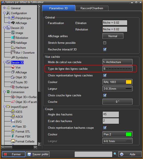 Permet de choisir le type de ligne utilisé pour les entités représentant les arêtes cachées, générées par la conversion d'une vue 3D. Huit types de ligne sont disponibles (de 0 à 7). Le choix du type de ligne peut être défini dans Modif préférences sous la rubrique "Paramètres 3D".