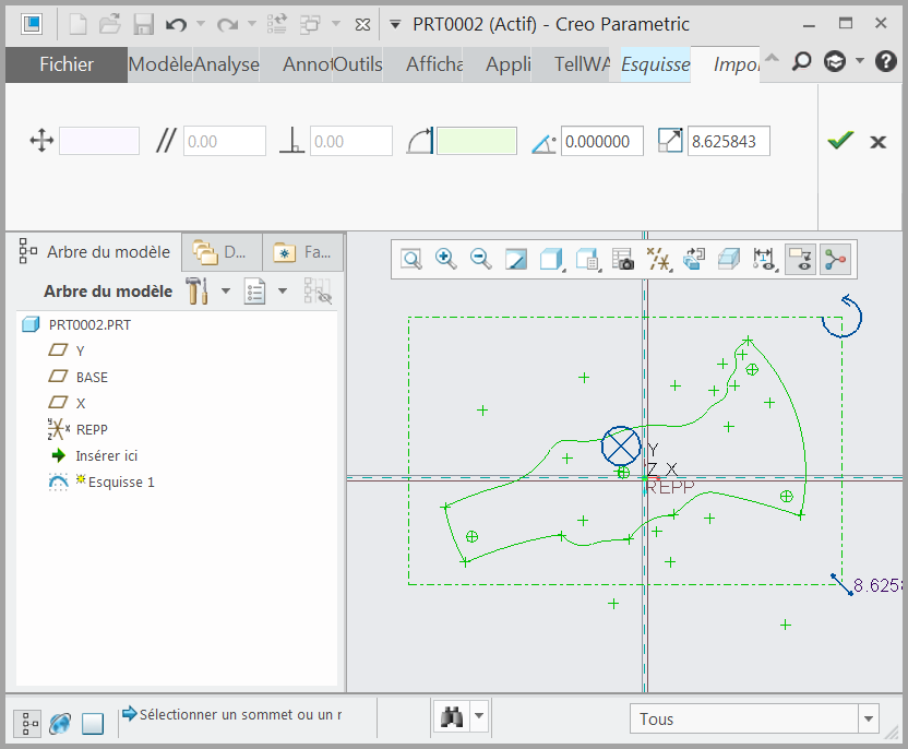 1. L'esquisse doit être en mode d'édition. 2. Si les entités de Tell à importer ne sont pas sélectionnées au préalable, la fenêtre de Tell se met en avant permettant de sélectionner celles-ci. Sélectionner les entités et valider.