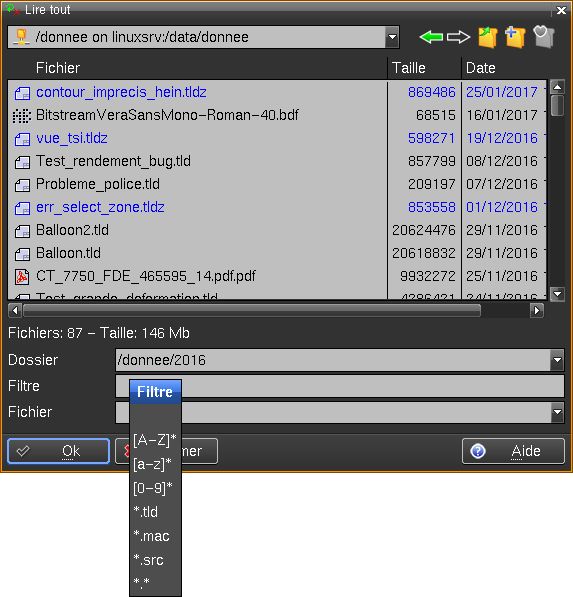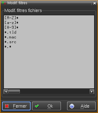 Il est possible d'ajouter directement les lignes désirées pour créer des filtres. Ces filtres apparaitront lors d'une ouverture de fichier, par exemple "Lire Tout"(34), avec la touche "MODIF" de la souris dans la zone filtre: